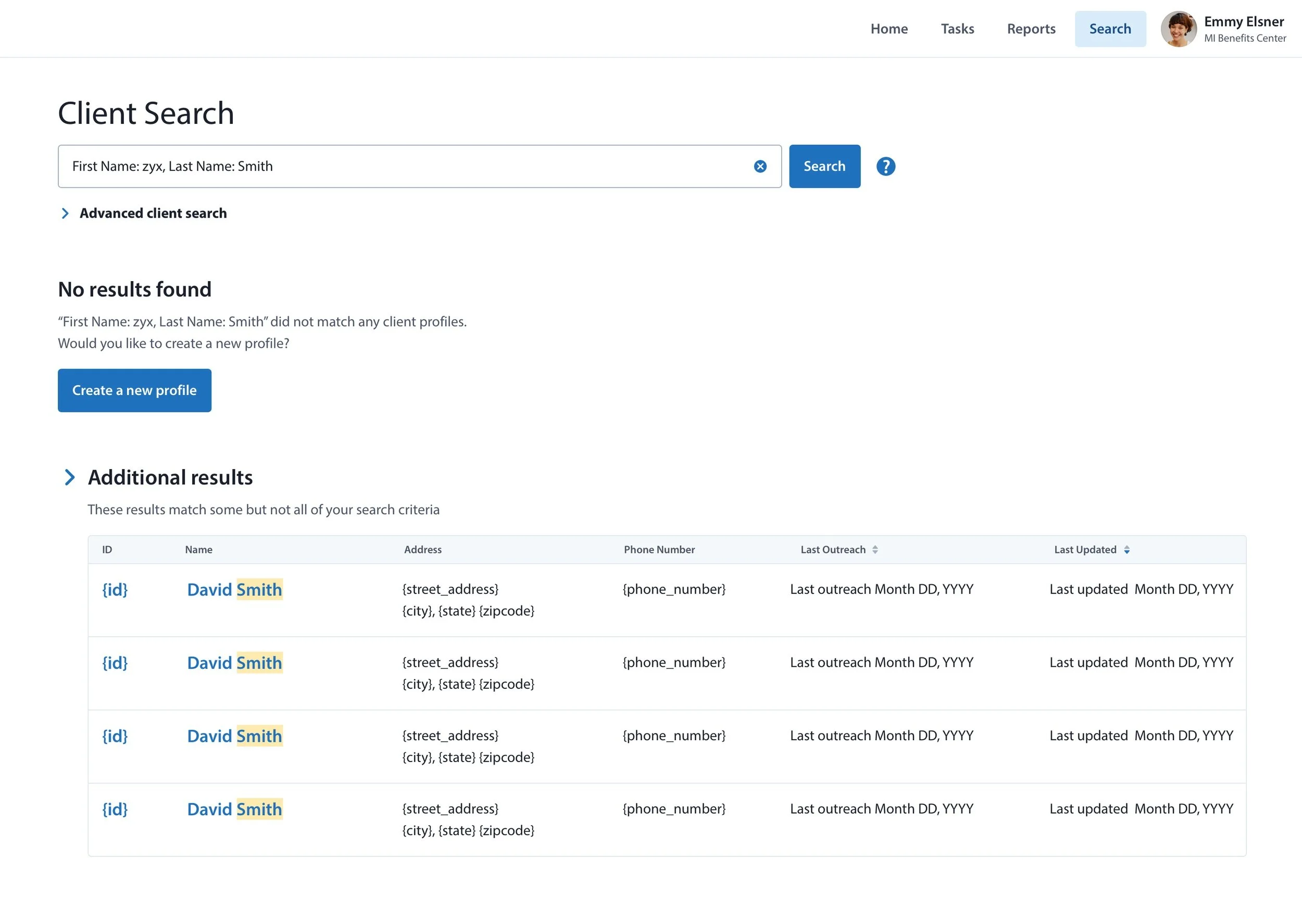 An advanced search provides two sections of results. A primary table provides matches for clients that fulfill all search fields. While an ‘Additional Results’ table provides a secondary table of clients that match some but not all fields.